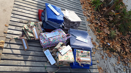 En décembre, nous sommes allé.e.s distribuer nos créations à certains commerçants du marché de produits locaux du mercredi, pour qu'il puissent à leur tour les offrir à leurs clients. Une étiquette mentionnant l'association a été ajoutée à chaque sac. N'ayant pu en donner à tous les commerçants, nous envisageons de continuer à coudre des sacs.